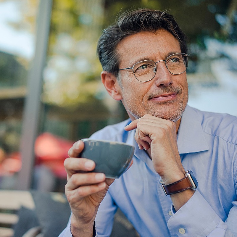 Ein Mann trinkt draußen eine Tasse Kaffee und schaut seitlich in die Kamera.