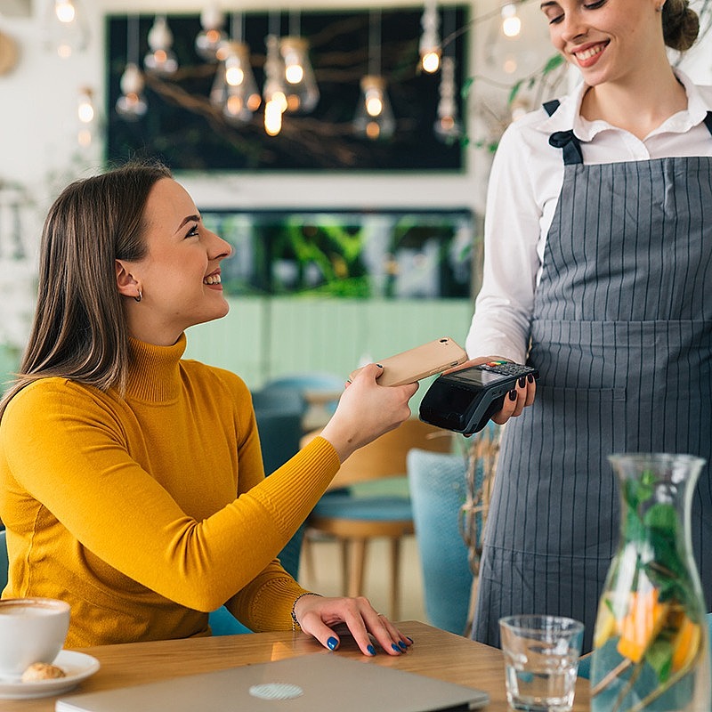 Eine Frau bezahlt in einem Café ihren Kaffee bei der Kellnerin mit Karte.
