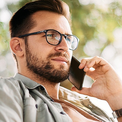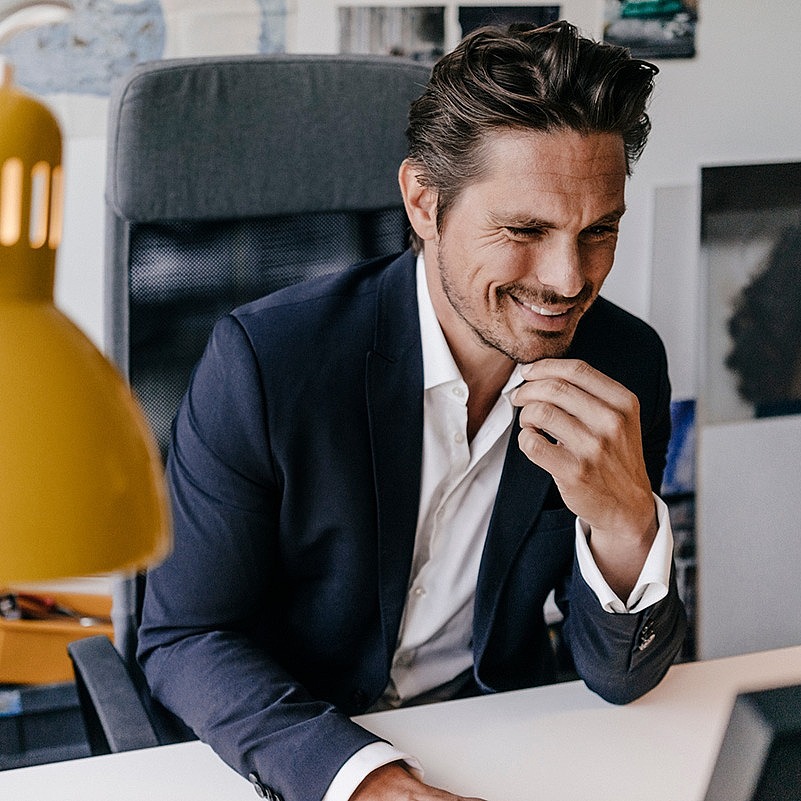 Ein Mann sitzt in seinem Büro am Schreitisch und schaut lächelnd auf den Bildschirm seines Computers.