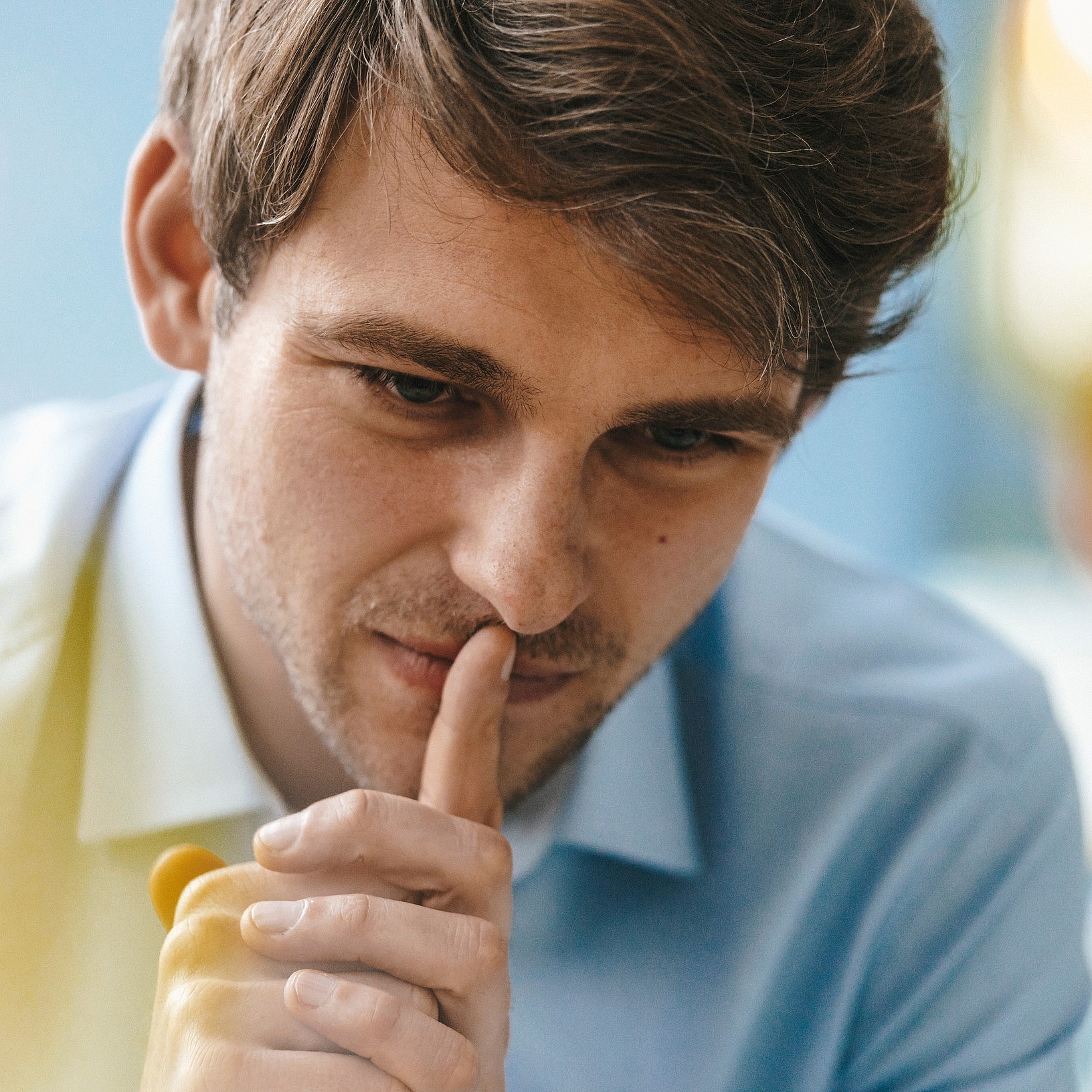 Junger Mann mit Finger an den Lippen schaut bedrückt
