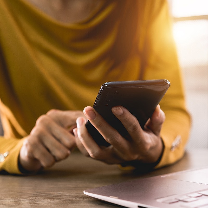 Eine Frau mit einem gelben Oberteil tippt auf ihrem Smartphone.