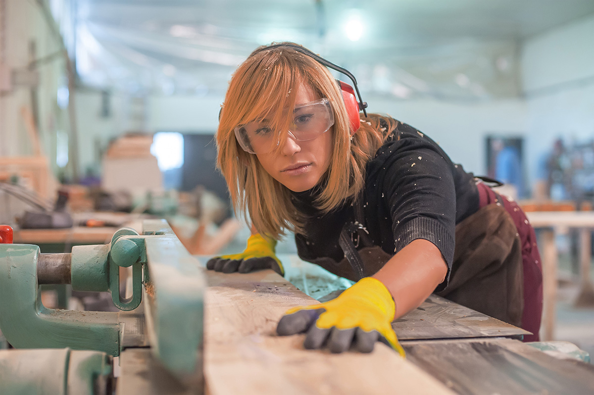 Eine junge Frau steht mit Schutzkleidung an einer Werkbank und sägt ein Stück Holz.