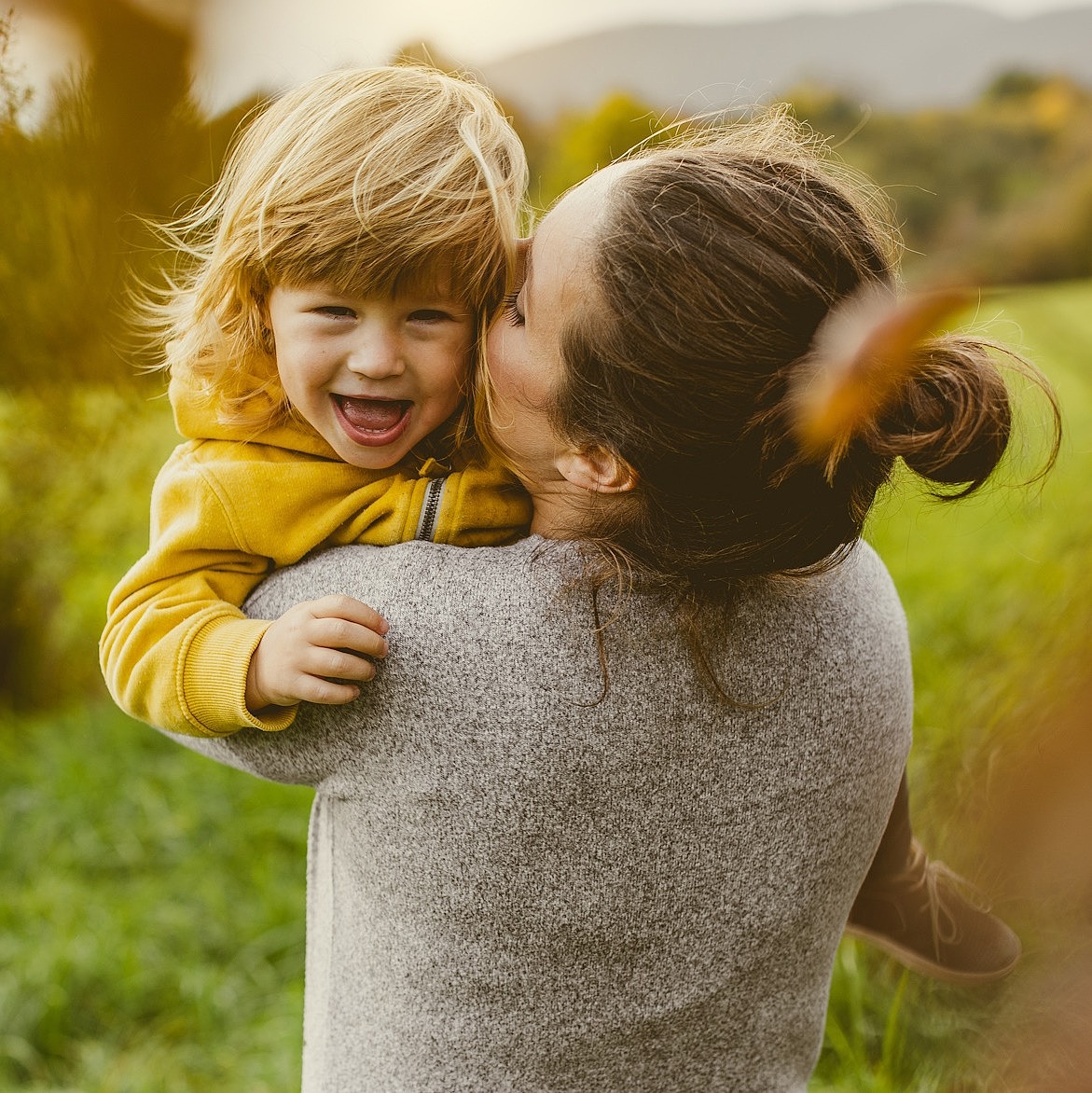 Eine junge Frau steht mit dem Rücken zu Kamera und hat ihre Tochter im Arm.