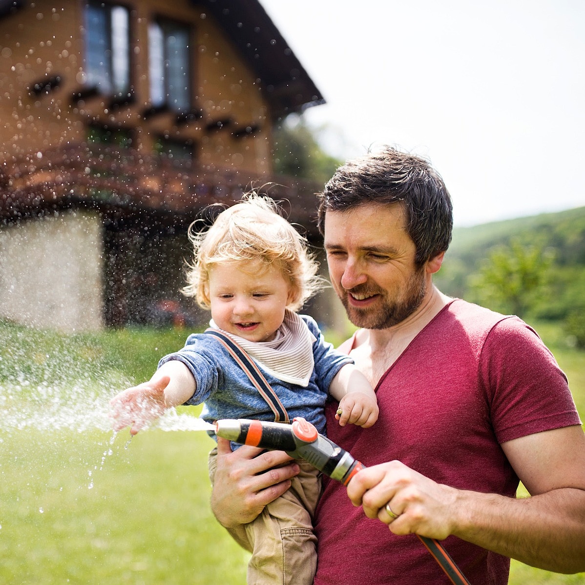 Ein Mann hat sein Baby im Arm. Sie stehen vor einem Haus auf einer Wiese und halten einen Gartenschlauch in der Hand, aus dem Wasser spritzt.