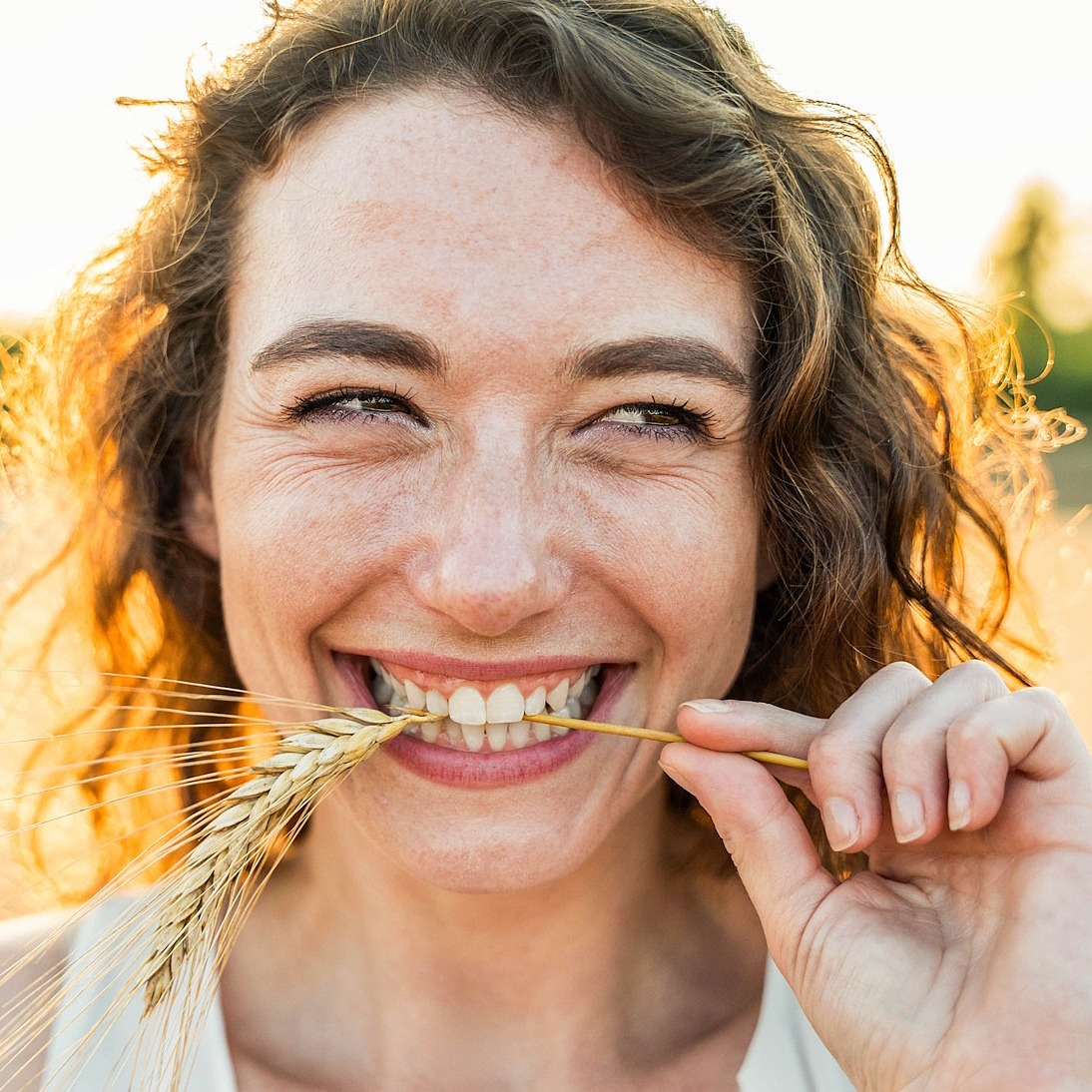 Eine junge Frau steht auf einem Feld, lächelt in die Kamera und hat eine Ähre im Mund.