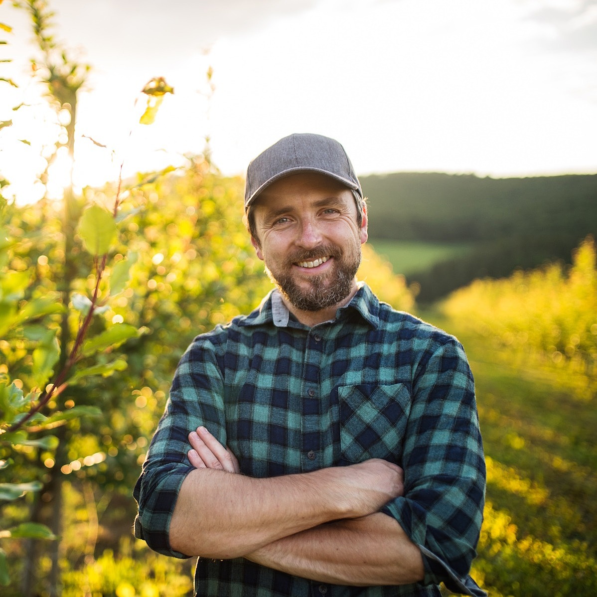 Ein junger Mann steht draußen auf einer Wiese vor einem Busch, hat die Arme verschränkt und schaut in die Kamera.