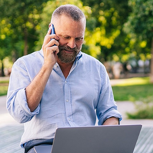 Ein Mann sitzt in seinem Büro am Schreitisch und schaut lächelnd auf den Bildschirm seines Computers.