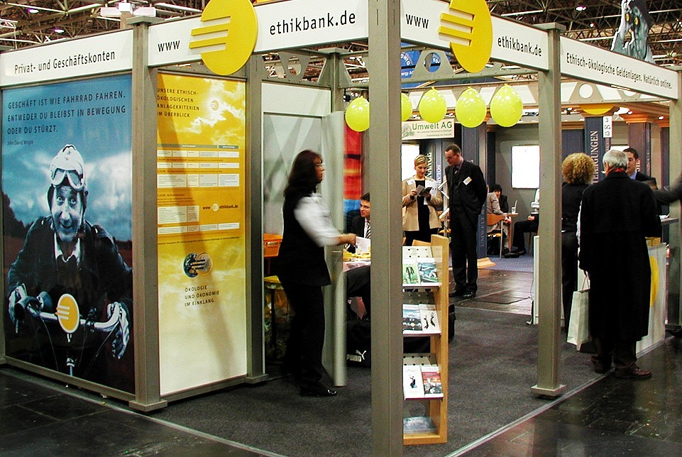 Informationsstand der EthikBank auf einer Messe in Düsseldorf im Jahr 2002.