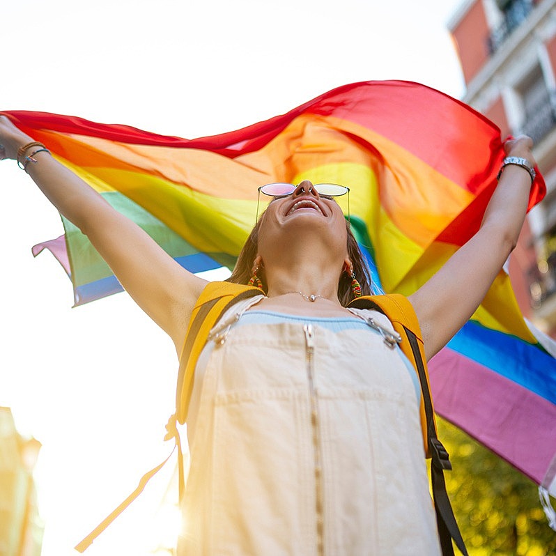 Eine junge Frau hält eine Regenbogenflagge über ihren Kopf.